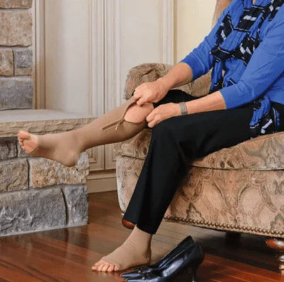 1️⃣ Coloca la PressFit Pro en el pie y deslízala cuidadosamente por la pierna.